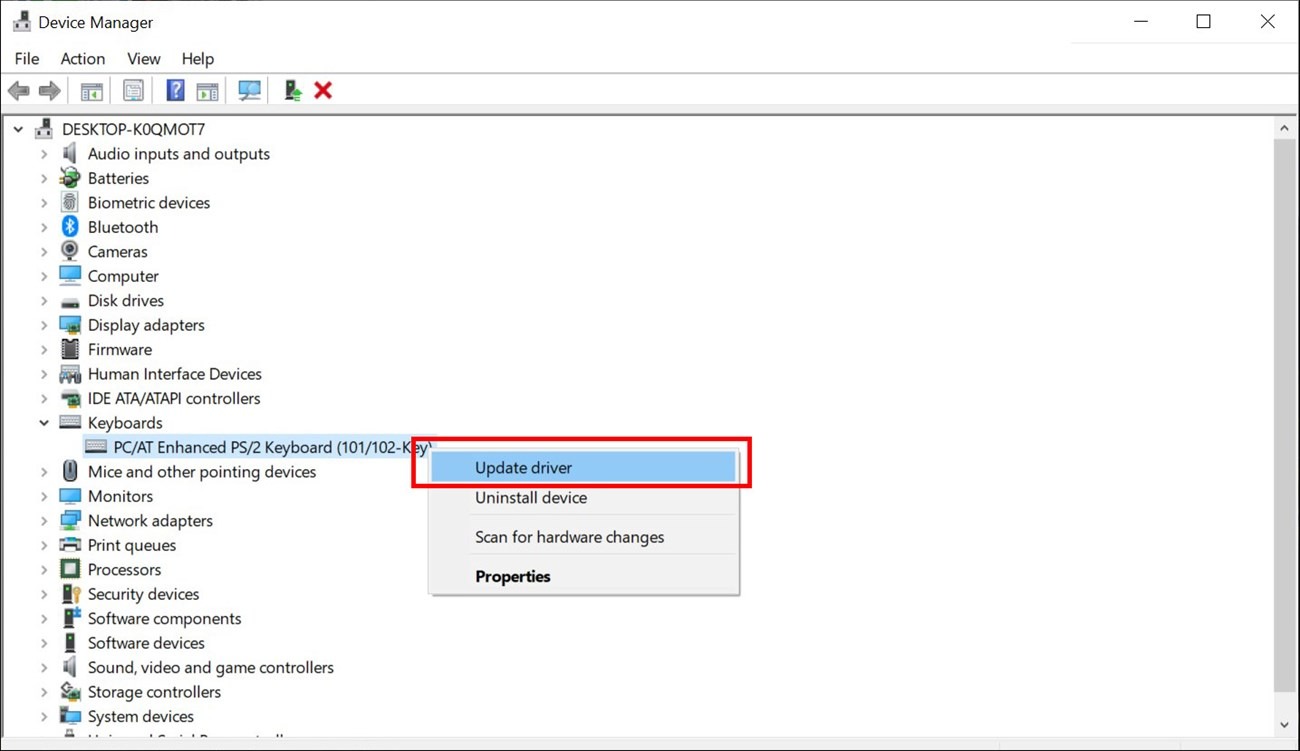 Bước 2: Tại Keyboards, nhấn chuột phải và chọn Update Driver.
