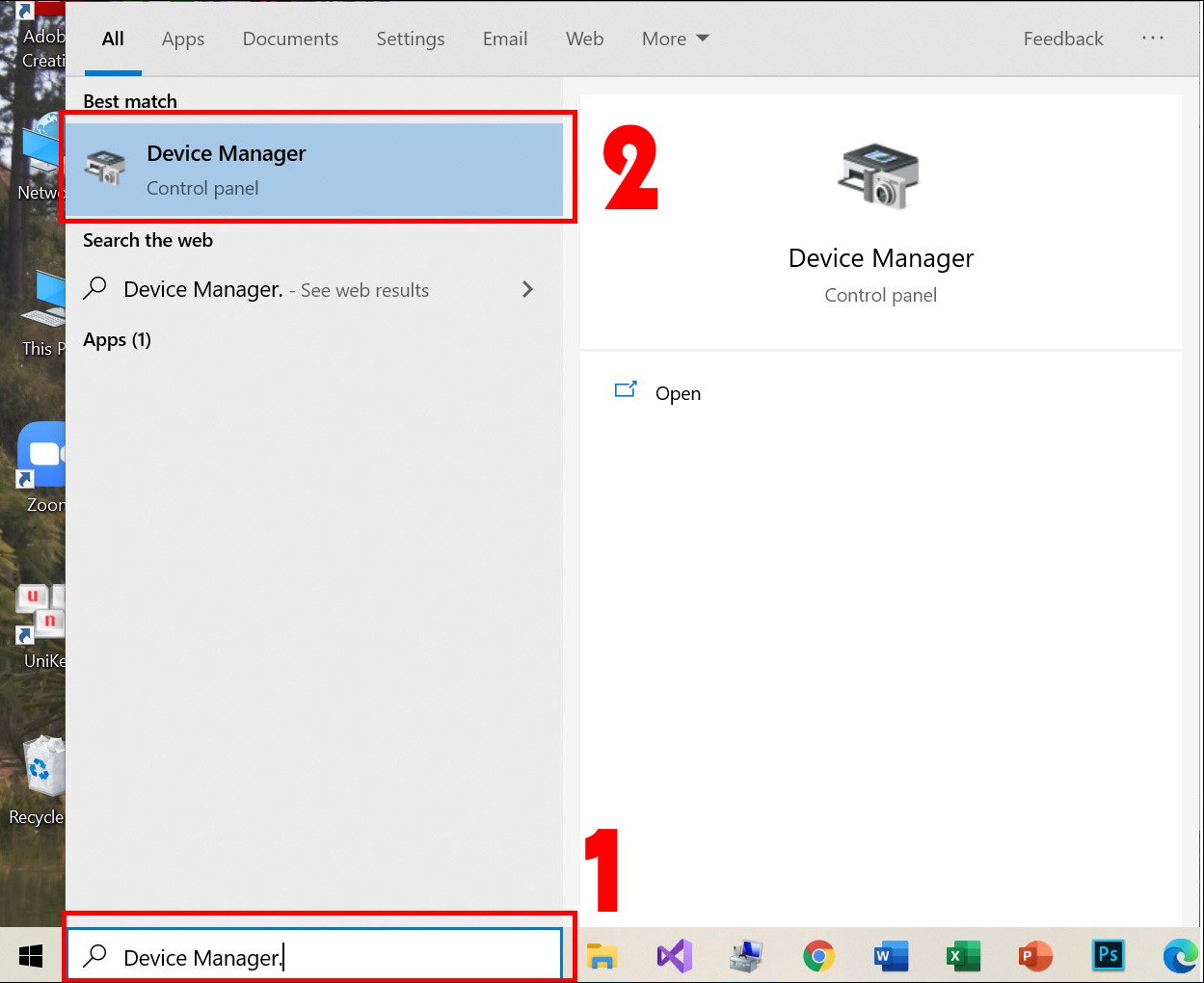 Bước 1: Gõ Device Manager vào thanh tìm kiếm trên laptop và nhấn chọn.