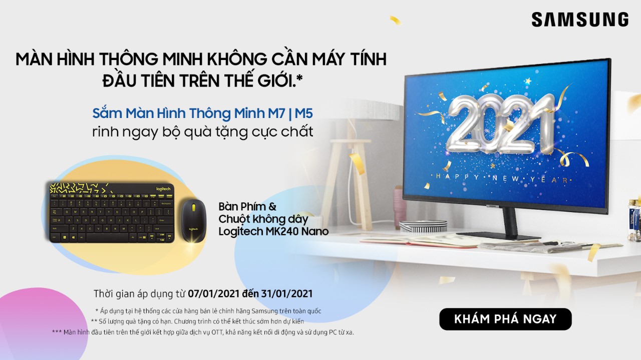 Chào đón những ngày đầu của năm 2021, Samsung mang đến Chương trình ưu đãi hấp dẫn dành tặng quý khách hàng: “Sắm màn hình Samsung M7|M5, tặng ngay bàn phím & chuột không dây Logitech MK240 Nano”.