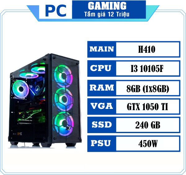 Đối với cấu hình trong mức giá này sẽ đáp ứng được hầu hết những tựa game hot hiện nay với mức đồ họa thích hợp. CPU Intel I3 10105F là một trong những con CPU quá chất lượng so với mức giá của nó. Có 4 nhân 8 luồng và sức mạnh đơn nhân rất tốt nhưng tiêu hao điện năng và tỏa nhiệt không cao nên bạn không cần lo lắng nhiều về vấn đề tản nhiệt cho CPU. VGA GTX 1050 Ti được coi là “Card Quốc Dân” vì hiệu năng trên giá thành cho nó rất tốt, có thể đáp ứng được hầu hết những tựa game hot hiện nay với mức setting phù hợp. Chỉ với tầm giá khoảng 12 Triệu đồng các bạn có thể sở hữu một bộ PC Gaming có hiệu năng rất tốt so với giá thành. Hiện tại chúng mình đang có sẵn cấu hình này tại TMD Computer, và đặc biệt TMD Computer hiện đang có chương trình khuyến mại đối với Bộ PC Gaming tầm giá trên 10 Triệu sẽ được giảm 550K tiền mặt, các bạn có thể tham khảo TẠI ĐÂY.