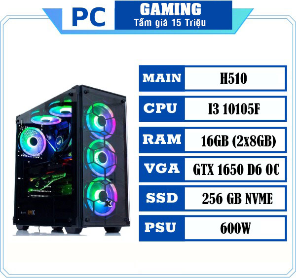 Đối với cấu hình tầm giá khoảng 15 Triệu, các bạn sẽ được trải nghiệm hầu hết những tựa game hot nhất hiện nay. Đối với cấu hình ở tầm giá này các bạn sẽ được trang bị một chiếc Mainboard có chipset mới hơn, mức Ram cao hơn, SSD chuẩn NVME cho tốc độ Boot Win và vào Game nhanh hơn, thậm chí còn có một con VGA mạnh hơn. VGA GTX 1650 là lựa chọn tốt nhất trong thời buổi bão giá VGA như hiện nay, nhưng bạn yên tâm là nó sẽ đáp ứng rất tốt nhu cầu Gaming tầm Trung với những tựa game Esport như Liên minh huyền thoại, FO4,… ở mức setting cao nhất và những game hot trong thời gian hiện nay như PUBG PC, GTA V, Valorant, …. Hiện tại chúng mình đang có sẵn cấu hình này tại TMD Computer, và đặc biệt TMD Computer hiện đang có chương trình khuyến mại đối với Bộ PC Gaming tầm giá trên 15 Triệu sẽ được giảm 750K tiền mặt, các bạn có thể tham khảo chi tiết TẠI ĐÂY.