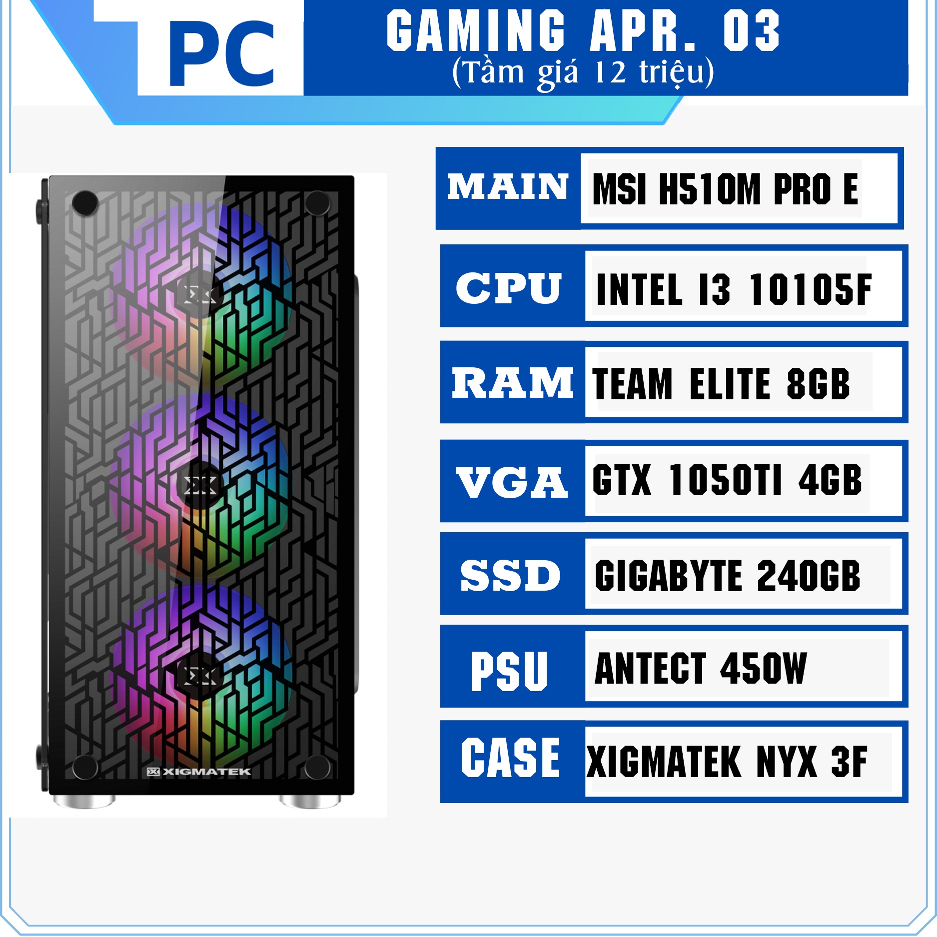 3. PC Gaming Apr.03 (i3 10105F/ Ram 8Gb / GTX 1050Ti/ 240GB)